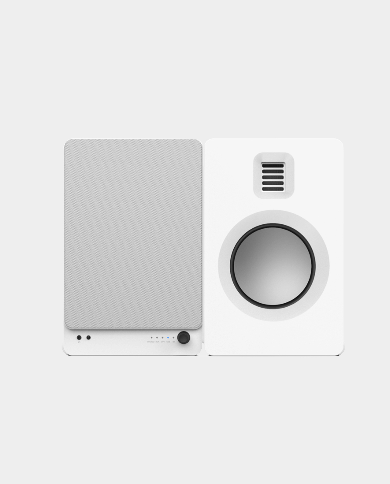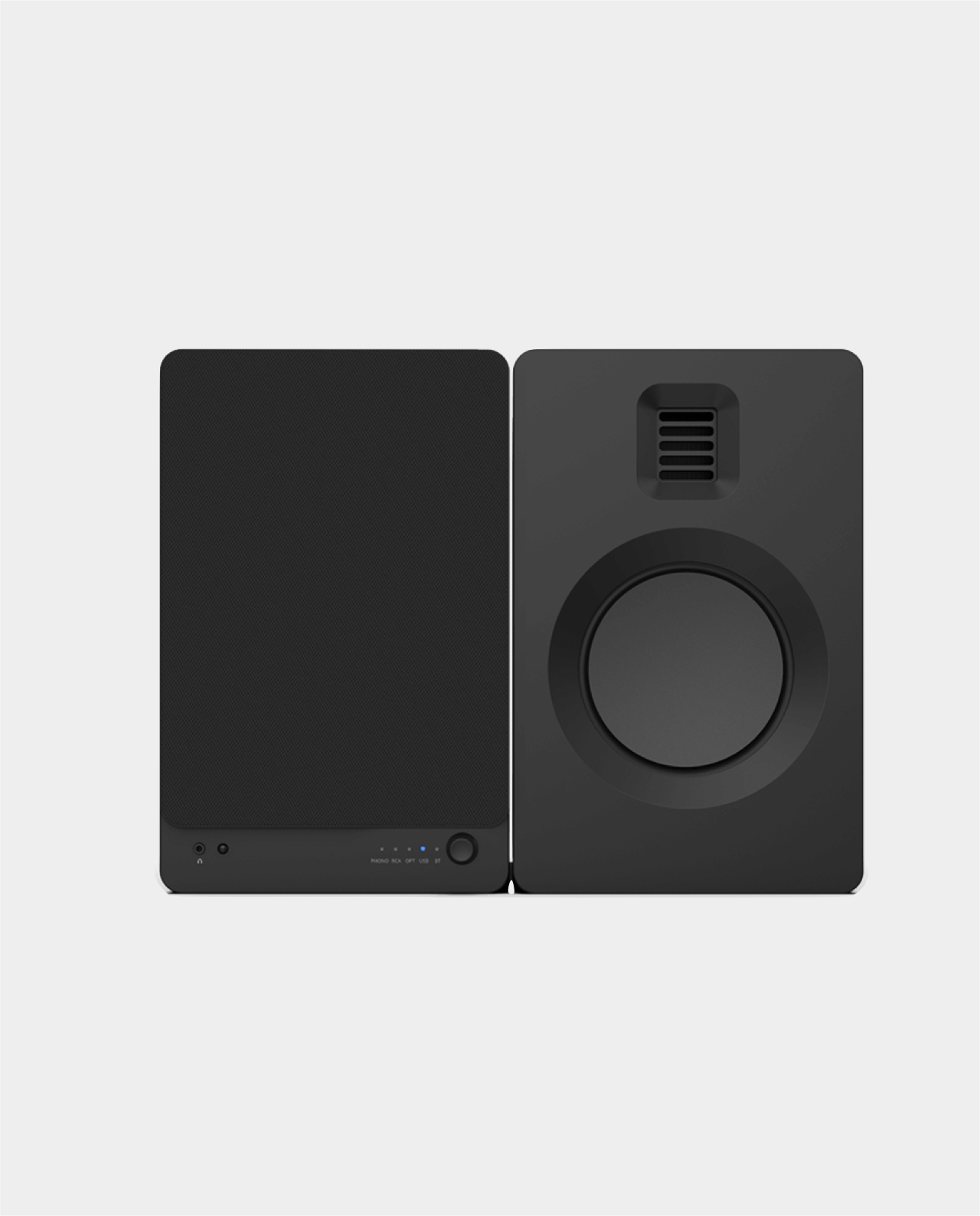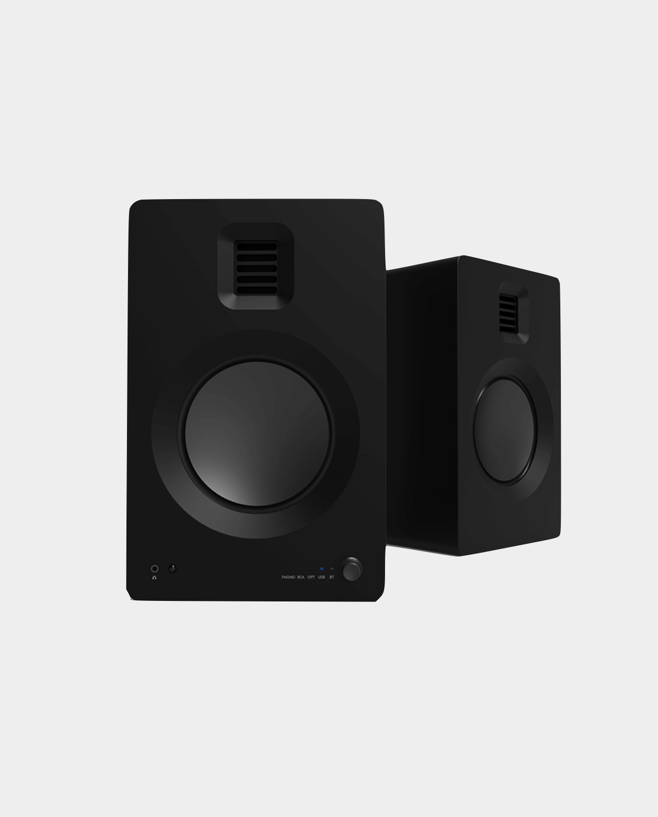 Diffusori amplificati a due vie da libreria. Bass reflex posteriore.